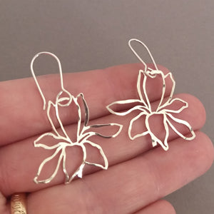 These sweet floral earrings are cut out by hand from 1mm thick sterling silver plate, and then sanded, forged to give texture, and then polished to a shiny finish..